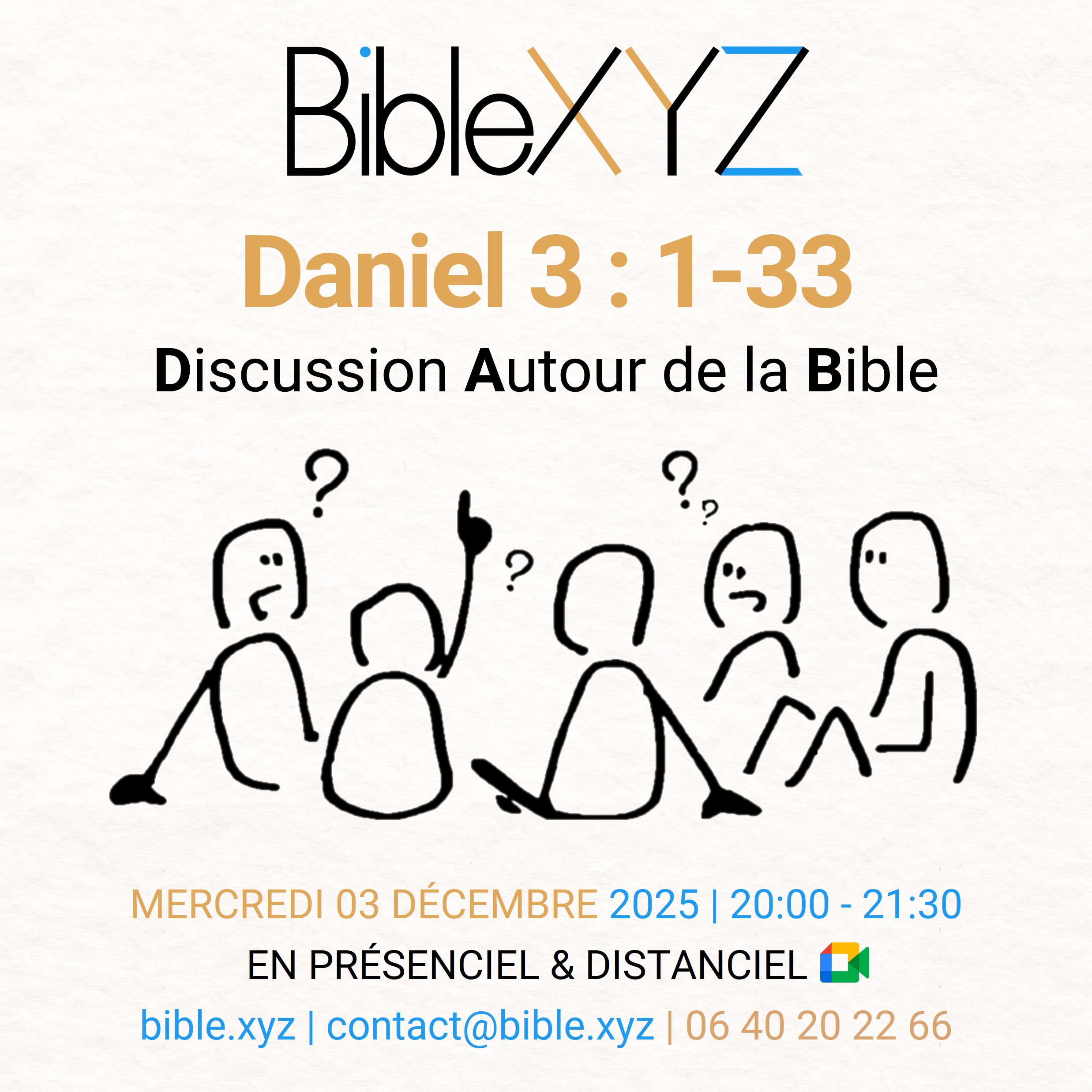 D.A.B (et D.A.B.C) en PrésenCIEL et/ou en DistanCIEL les mercredis soirs à 20h00. Ajoutez les à votre agenda et contactez-nous : contact@bible.xyz | 06 40 20 22 66.